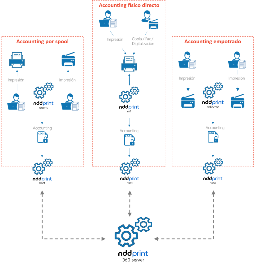 El Accounting de los trabajos en el NDD Print 360 es hecho a través de los módulos agentes que son responsables por la monitorización y colecta de las informaciones de los trabajos de impresión, copias, digitalización y fax.