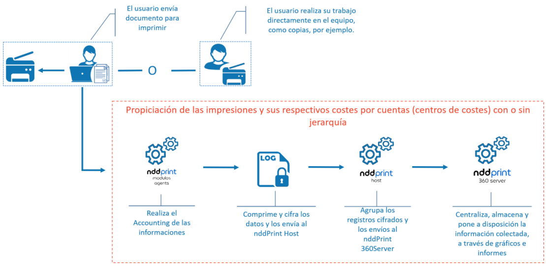 Las cuentas son unidades o métodos organizacionales utilizados a fin de clasificar el ambiente de impresión, y en el NDD Print 360, pueden ser, por ejemplo: Centros de costes, proyectos, áreas, clientes o departamentos.
