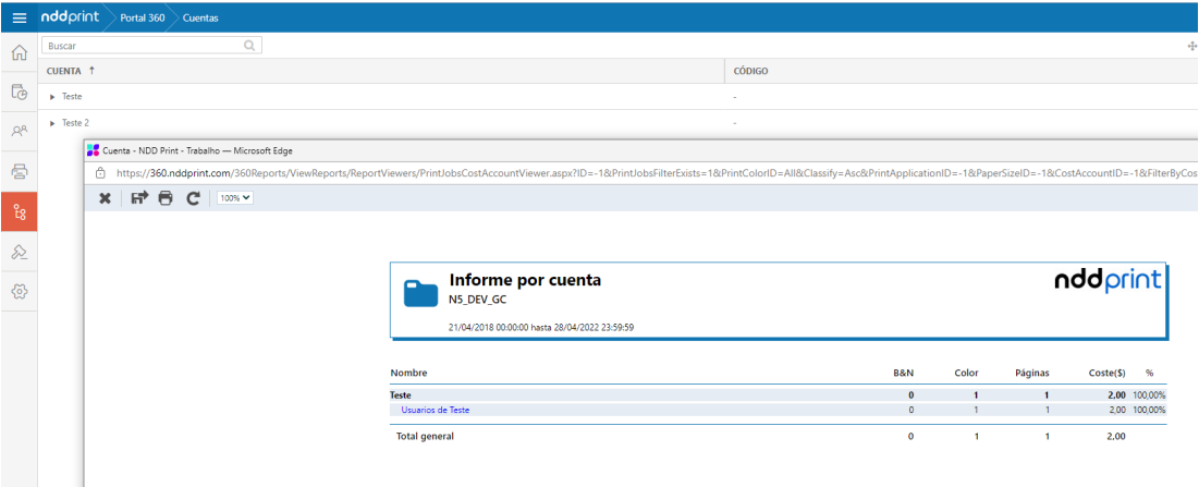 La gestión de las cuentas y la visualización de informes y gráficos es hecha en el portal de administración del NDD Print 360 Server, abajo, tenemos un ejemplo de utilización de cuentas configuradas por usuario con jerarquía por centro de coste.