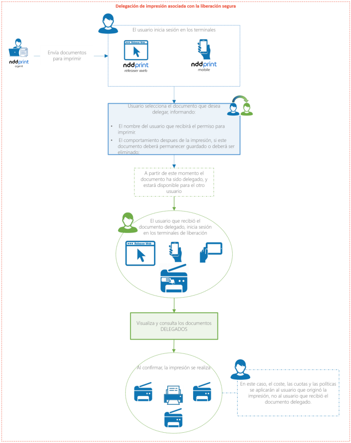 Esta funcionalidad permite a los usuarios delegaren una impresión a otra persona, permitiendo así, que esta otra persona, libere el documento mediante login en los terminales de liberación (liberación segura). Observe que en este caso el usuario que imprime no es lo mismo que retira la impresión en el equipo.