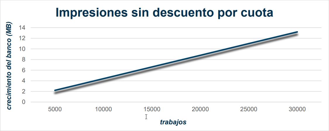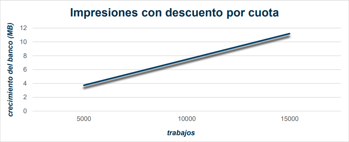 Esos resultados muestran que un banco de datos crece cerca de 7,46 MB por 10.000 trabajos de impresión en escenarios donde el control de cuotas es realizado, y crece cerca de 4,4 MB por 10.000 trabajos de impresión en escenarios donde el control de cuotas no es realizado.