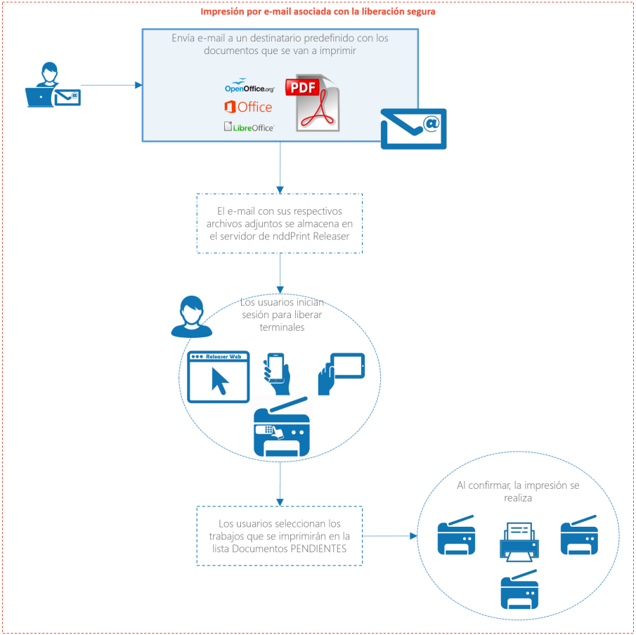 Esta funcionalidad permite a los usuarios enviaren los archivos que desean imprimir para un e-mail configurado y estándar, que funcionará como una cola de impresión, manteniendo los documentos retenidos hasta la impresión mediante liberación segura.