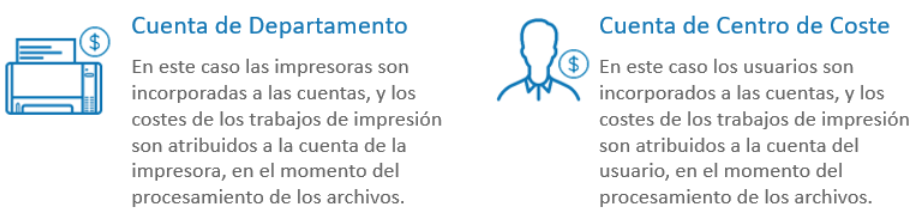 Las cuentas son unidades o métodos organizacionales utilizados a fin de sectorizar y/o clasificar el entorno de impresión. Ellas pueden ser configuradas por impresora, donde cada cuenta tendrá impresoras asociadas, o pueden ser configuradas por usuario, de esa forma cada usuario pertenecerá a una cuenta.
