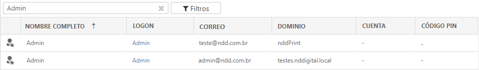 💡 EJEMPLO Haciendo la pesquisa sólo por "Admin": En este caso el resultado presenta todos los registros que contienen el valor informado. ![]() ejemplo de filtro de pesquisa simple |