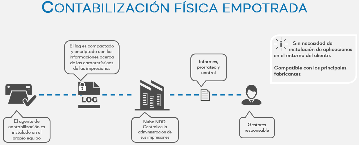 El agente de contabilización es instalado en el propio equipo, sin necesidad de instalar aplicaciones en el entorno del cliente.
