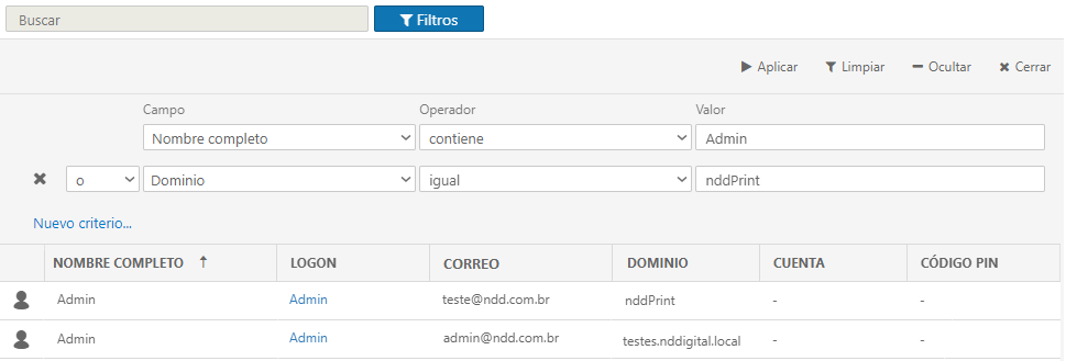 💡 EJEMPLO Haciendo la pesquisa sólo por "Admin": En este caso el resultado presenta todos los registros que contienen el valor informado. ![]() ejemplo de filtro de pesquisa simple |