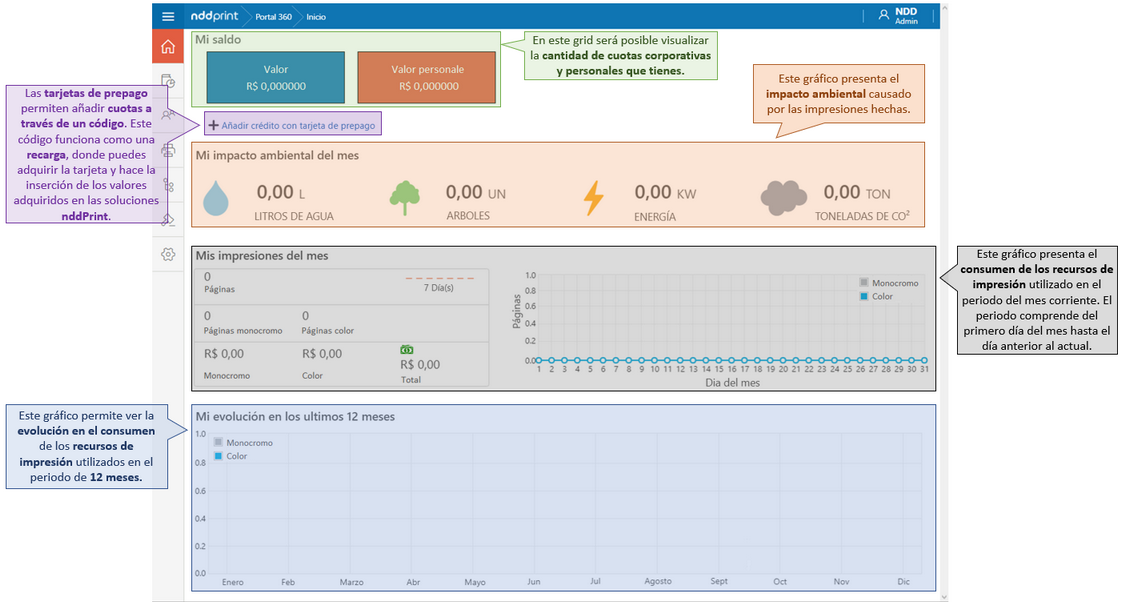 Esta visión presenta gráficos acerca de sus impresiones, el impacto ambiental causado por ellas, así como el saldo actual de cuotas y opción añadir créditos de prepagos.