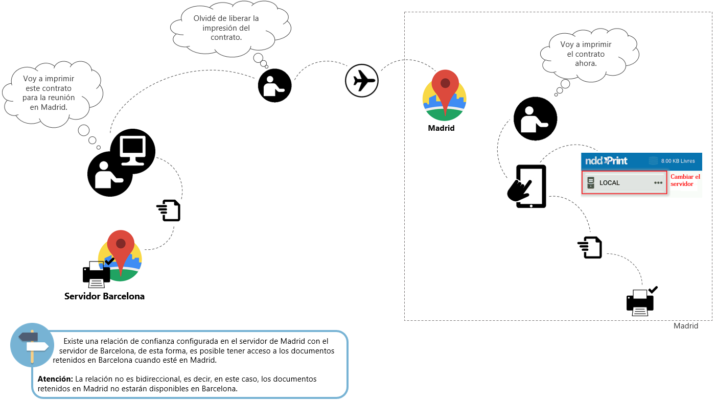La confianza es la relación de los grupos de impresión locales con los grupos de impresión remotos, de esta manera, es posible compartir documentos entre servidores Releaser diferentes para que un usuario que esté presente en otra red, o tenga trabajos almacenados en los dos servidores, pueda hacer la liberación de los trabajos de donde esté.