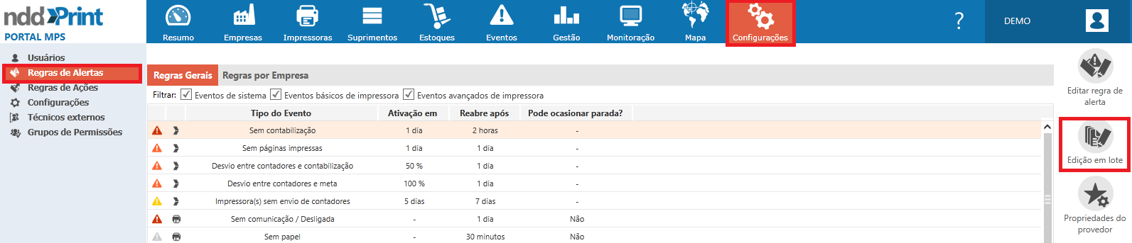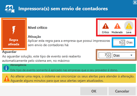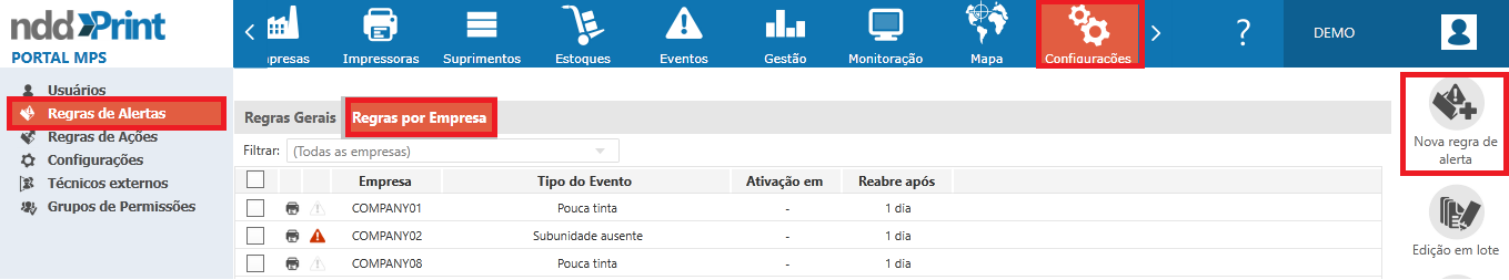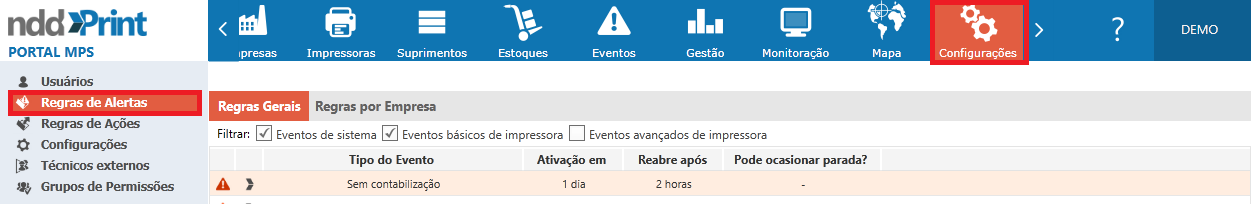 As regras de alerta são utilizadas para categorizar os alertas conforme sua criticidade, sendo possível aplicar as regras gerais, ou seja, que se aplicam a todas as empresas monitoradas no NDD Print MPS, ou criar regras específicas para a(s) empresa(s).