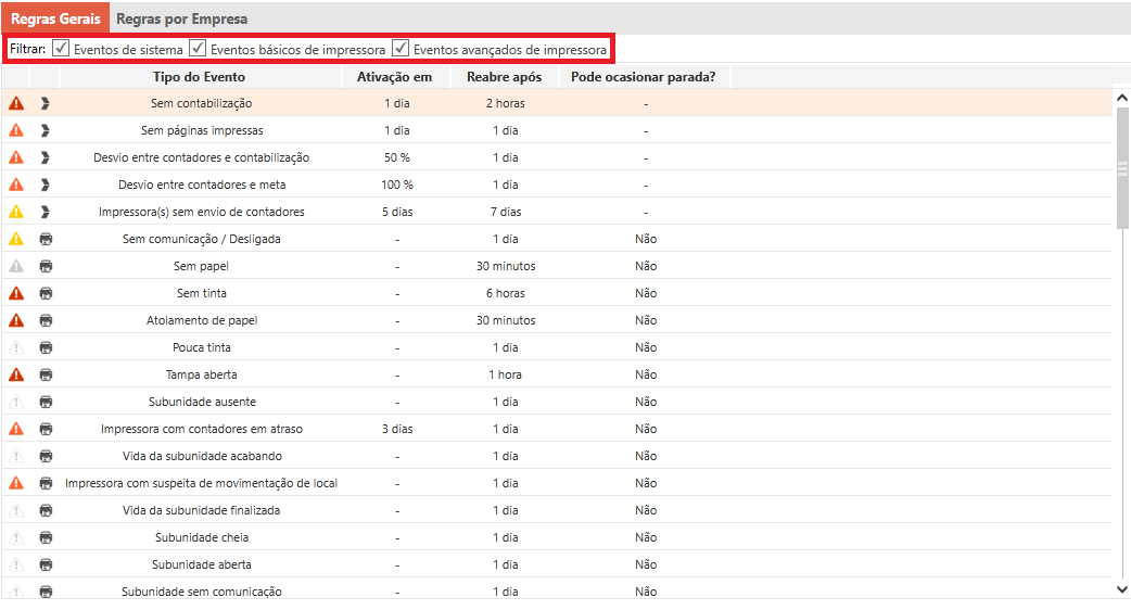 Eventos de impressoras: São eventos gerados pela própria impressora, dentro do NDD Print MPS eles são categorizados em eventos básicos e eventos avançados, que são referentes a problemas mais específicos das impressoras.