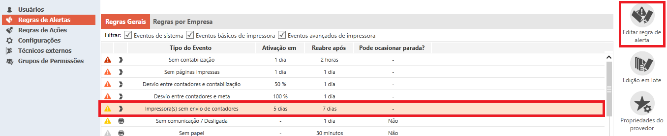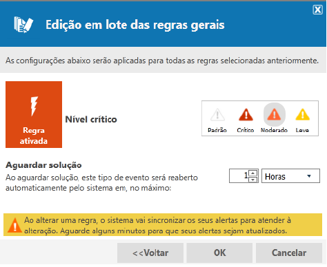 Caso deseje desativar ou alterar a criticidade de algum evento, basta selecioná-lo e ir em editar regra de alerta: