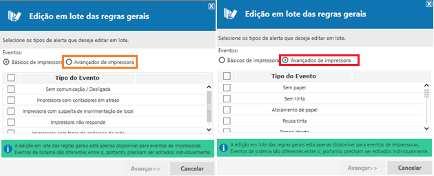 Eventos de impressoras (categorizados como eventos básicos e avançados).