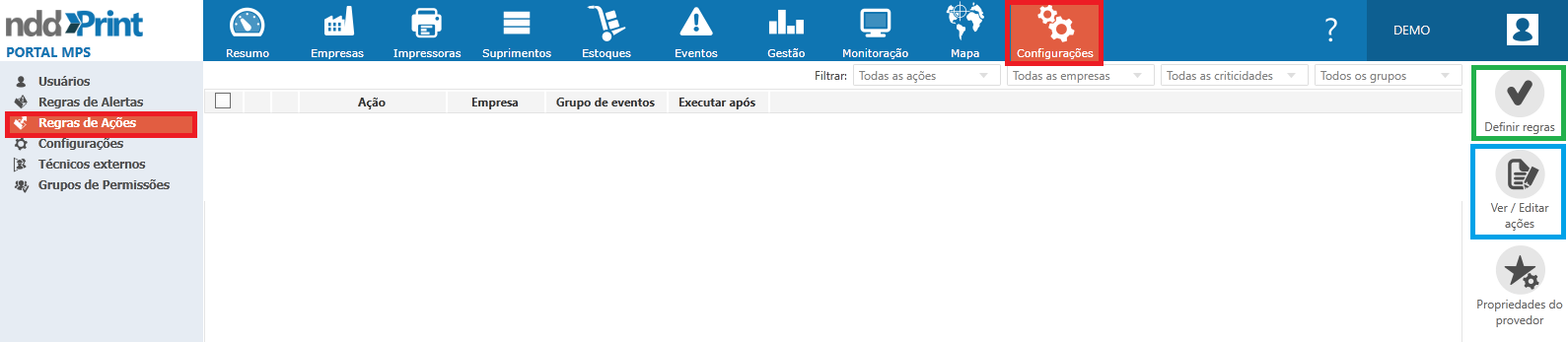de Ações mostra como poderão ser configuradas e executadas ações sobre os eventos gerados para determinado provedor no portal NDD Print MPS. Estas ações vão desde enviar e-mails aos responsáveis pelo evento, até fazer chamadas para um web service do provedor quando um evento for gerado.