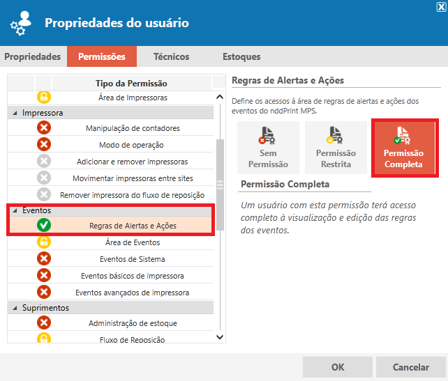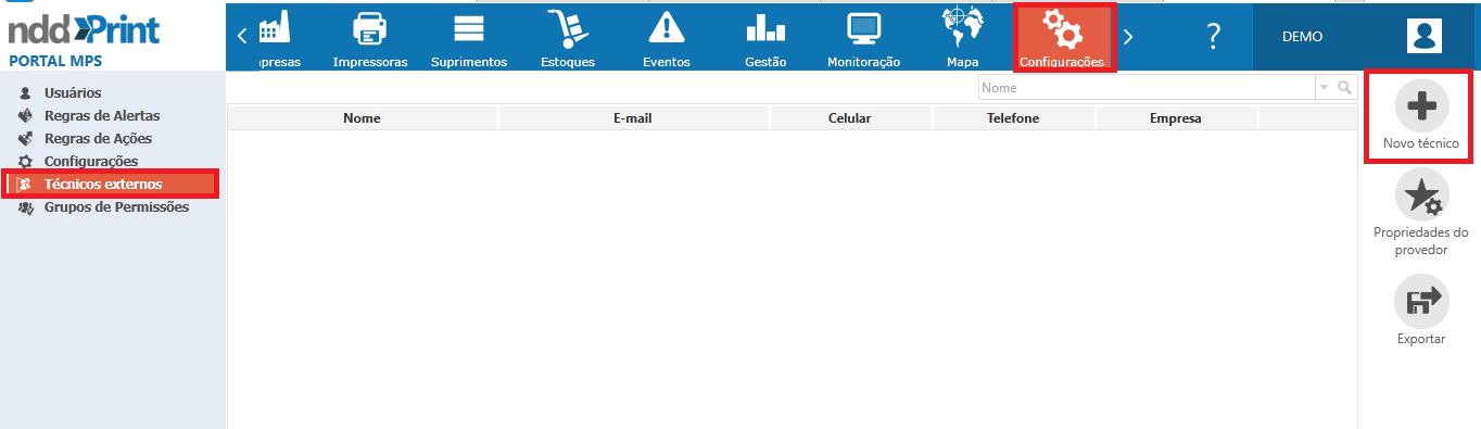 Os usuários com a permissão de técnico, são aqueles que possuem acesso ao portal NDD Print MPS, já os usuários registrados como técnico externo não possuem acesso ao NDD Print MPS, porém recebem o(s) e-mail(s) com os eventos, devidamente registrados em regras de ações/alertas.