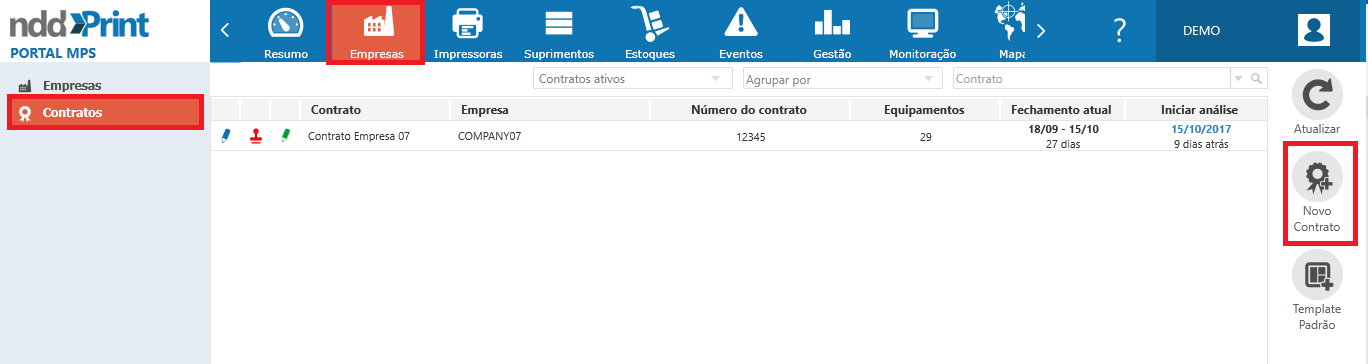 Para iniciar as parametrizações deve-se primeiramente criar o contrato, opção disponível na aba Empresas > Contratos > Novo contrato.