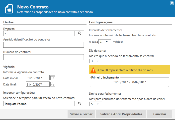 No momento da criação do contrato será apresentado uma tela solicitando a determinação das propriedades do contrato, o preenchimento das mesmas é obrigatório: