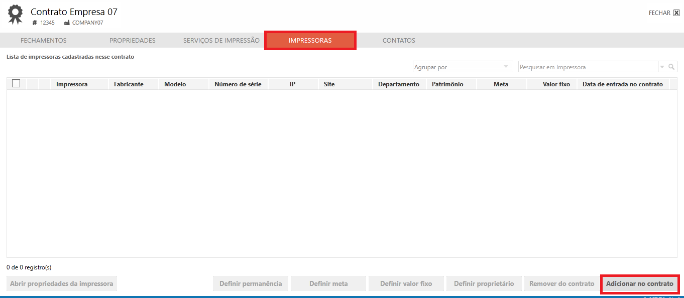 Após a criação do contrato deve-se adicionar as respectivas impressoras ao contrato, tal opção está presente nas Propriedades do contrato > Impressoras: