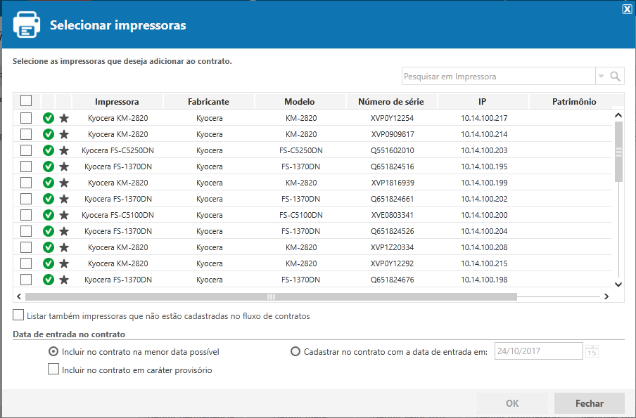 No momento de relacionar as impressoras do contrato será apresentado uma tela listando todas as impressoras da empresa, apresentando algumas opções que são: