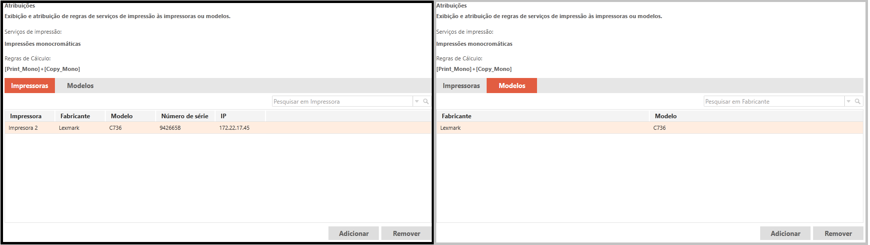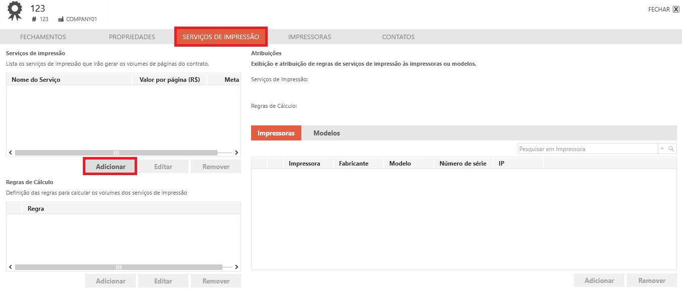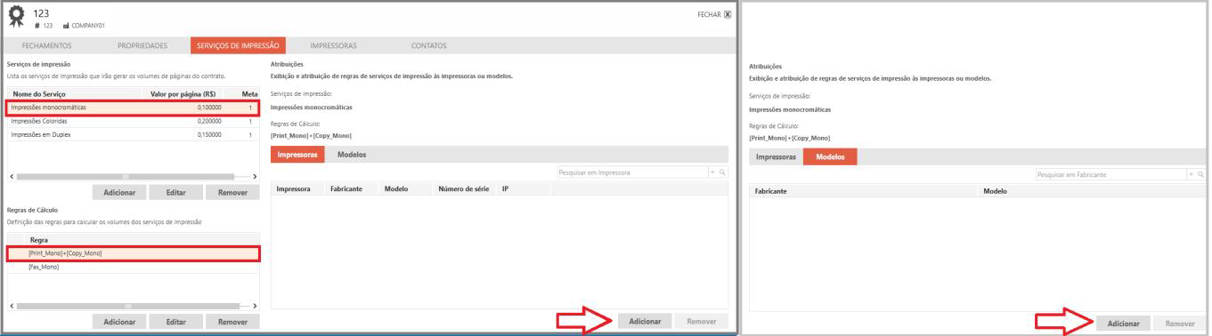 Após ser criado o serviço de impressão e a(s) regra(s) de cálculo do mesmo, é necessário dizer quais impressoras ou modelos que serão relacionadas a esta regra, para isto basta selecionar a regra de cálculo, após isso será habilitado o botão adicionar na aba de impressoras e modelos: