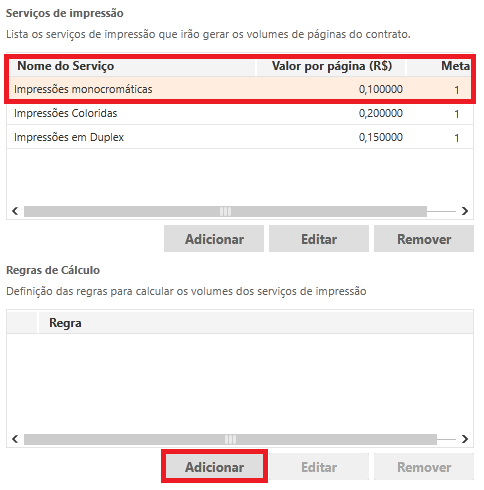 Para criar as regras, basta selecionar o respectivo serviço de impressão e será Habilitado o botão de Acionar no grid Regras de Cálculo: