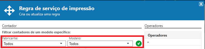 Sabemos que além das características de cada fabricante também pode haver características distintas entre os modelos do mesmo fabricante, dentre elas estão os contadores, que podem ter nomenclaturas distintas conforme as famílias/modelos de equipamentos, para isso no momento da criação das regras é possível filtrar os modelos/fabricantes para verificar corretamente o(s) nome(s) contadores: