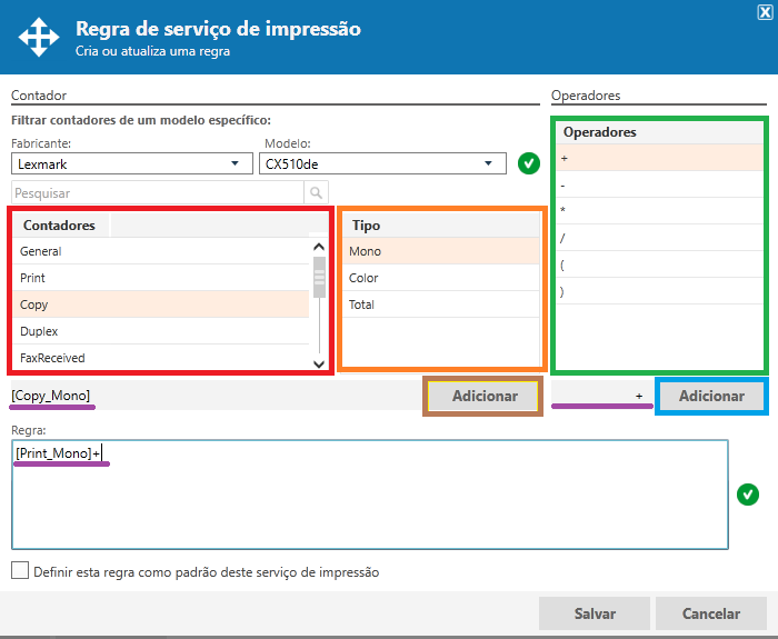 São basicamente os contadores que irão compor o serviço de impressão, essa composição pode ser matemática ou não, isso irá depender da forma de faturamento, por exemplo, para o compor o serviço de impressão Impressões monocromáticas de um determinado contrato utiliza-se a soma dos contadores: impressão/Mono + Copia/Mono, a soma destes contadores serão uma das possíveis regras de cálculo deste serviço.