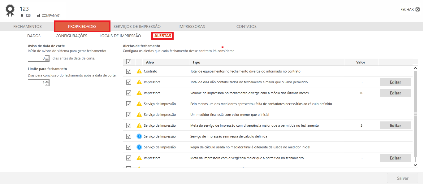 No momento da criação do serviço de impressão, é possível configurar uma meta do serviço para o período de fechamento, este valor também pode ser utilizado para gerar os alertas de desvio de meta do serviço de impressão.