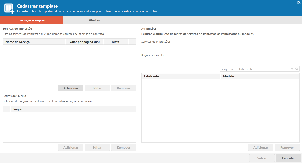 Como podemos observar neste template é possível parametrizar Serviços de Impressão, Regras de Cálculo e Alertas.