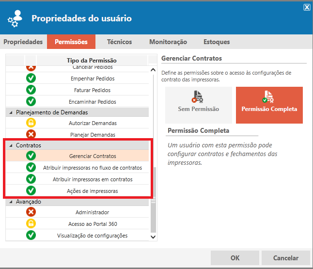Gerenciar contratos: Permissão Maior, sem ela não é possível habilitar as demais (detalhadas abaixo):