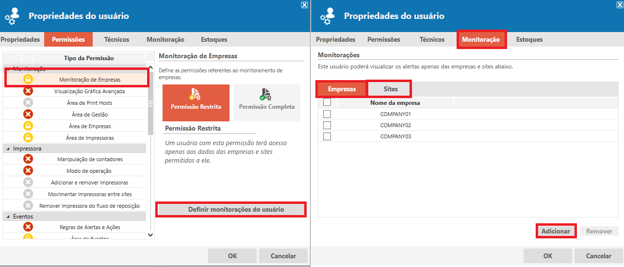 Lembrando que estas permissões (detalhadas acimas) estão diretamente relacionadas as permissões de Monitoração de empresa, ou seja, as regras de permissão de empresa irão permitir ou restringir a visualização das impressoras na(s) determinada(s) empresa(s) e/ou sites: