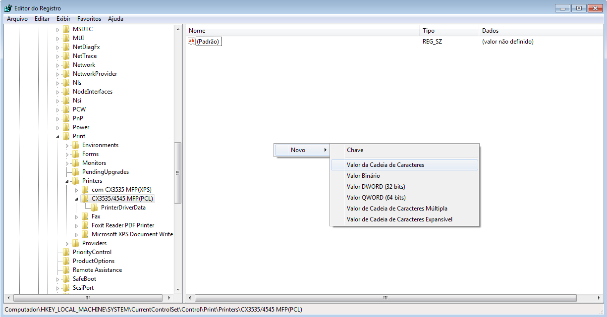 Para adicionar uma regra acesse o Editor do Registro (regedit - Executar) > abra as pastas HKEY_LOCAL_MACHINE\SYSTEM\CurrentControlSet\Control\Print\Printers\ > selecione a impressora que receberá as configurações > com o botão direito selecione novo "Valor da Cadeia de Caracteres"