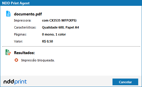 Quando não houver créditos de cotas de impressão suficientes para imprimir e o comportamento configurado é o bloqueio da impressão. Nestes casos será apresentada a mensagem: Impressão bloqueada: Não existem créditos de cotas de impressão disponíveis.