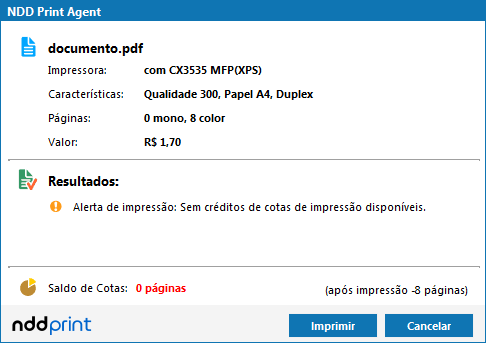 Quando não houver créditos de cotas de impressão suficientes para imprimir, e o comportamento configurado é o alerta. Nestes casos será apresentada a mensagem: Alerta de impressão: Sem créditos de cotas de impressão disponíveis
