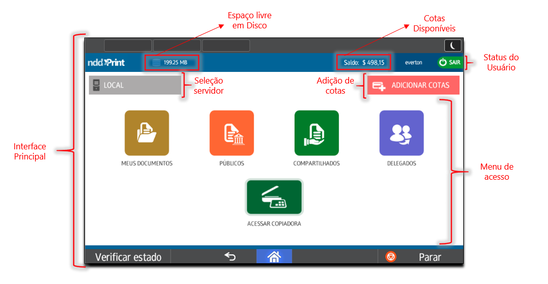 De acordo com as configurações escolhidas para o ambiente, o usuário poderá acessar os trabalhos de impressão através de Meus Documentos, Documentos Públicos, Documentos Compartilhados ou Documentos Delegados retidos, poderá acessar as funções nativas da MFD através do ícone Acessar Copiadora ou ícones de atalho, caso habilitados.