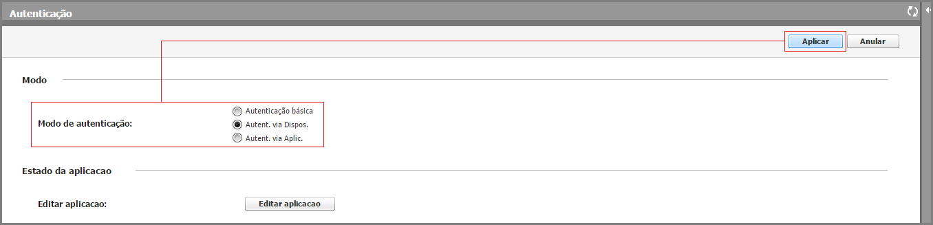 Em Modo, altere o Modo de Autenticação para "Aut. via Dispos."