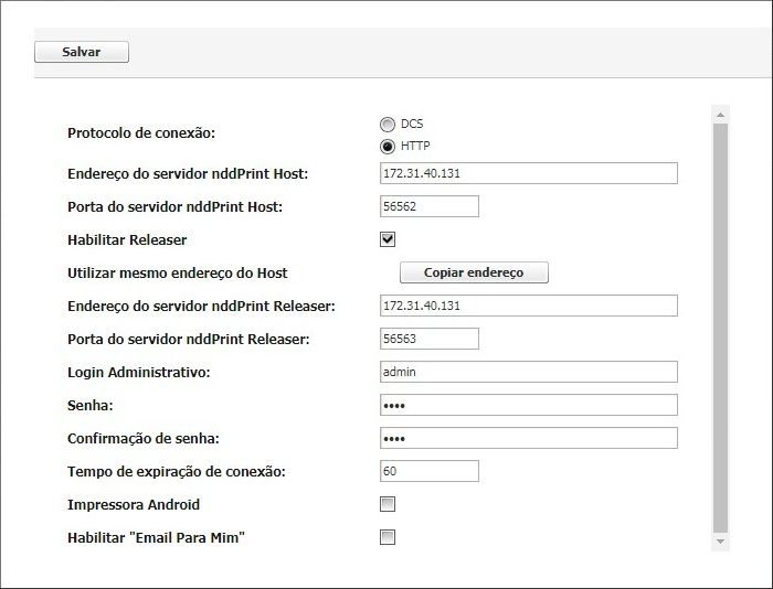 Utilizar mesmo endereço do Host: para utilizar o NDD Print Relaser junto ao servidor NDD Print Host, basta clicar nesta função para utilizar o mesmo endereço