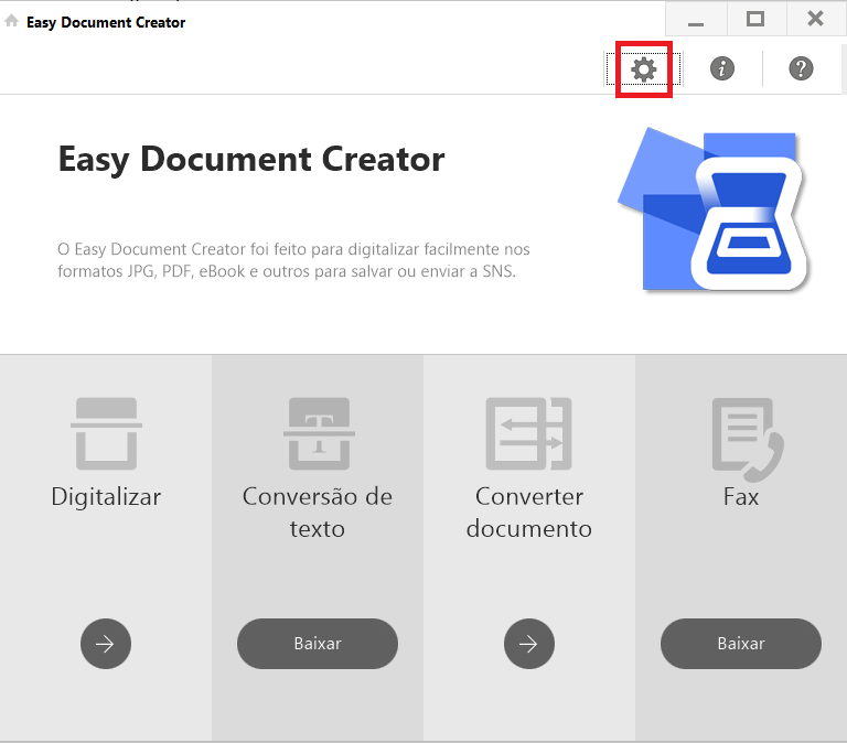Na tela inicial do Samsung Easy Document, clique na engrenagem para abrir as configurações