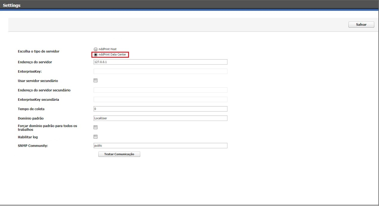 Escolha o tipo de servidor: selecione NDD Print Data Center;