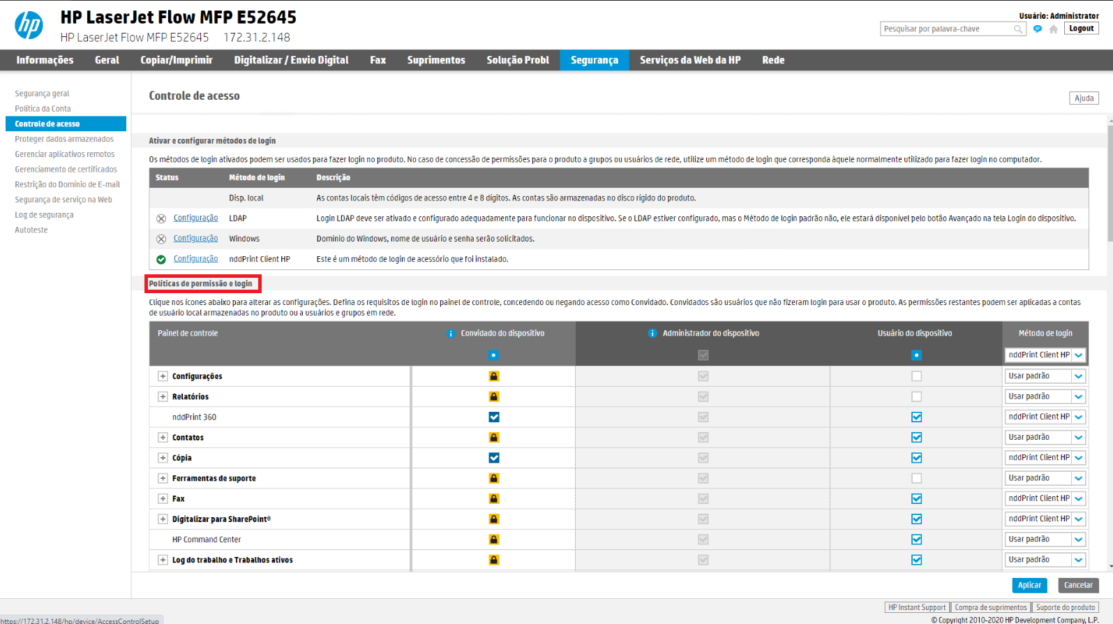 Defina o Método de login do Painel de controle e as funcionalidades marcadas como método de login NDD Print Client HP (coluna ao lado).