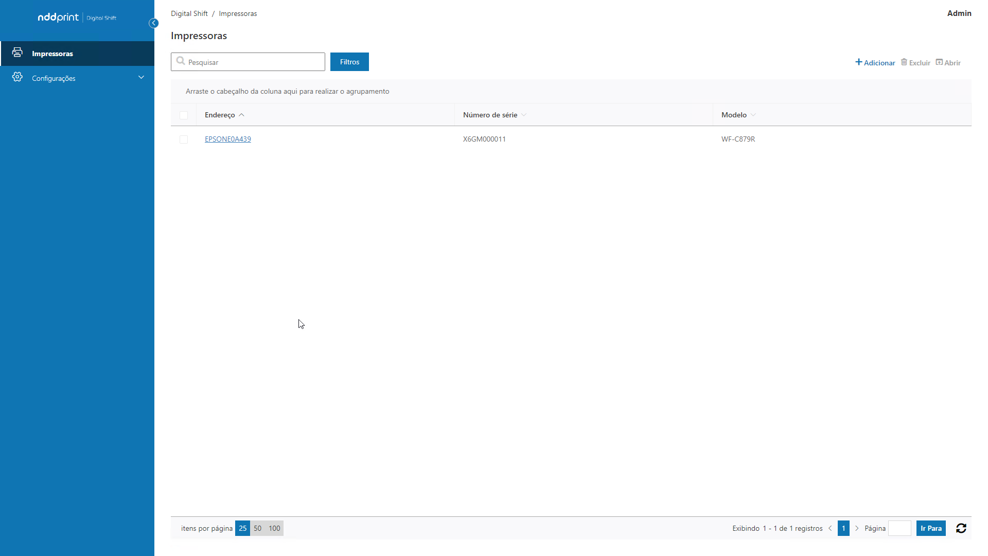 Para remover equipamentos > menu Impressoras > selecione o(s) equipamento(s) desejado(s) > Excluir