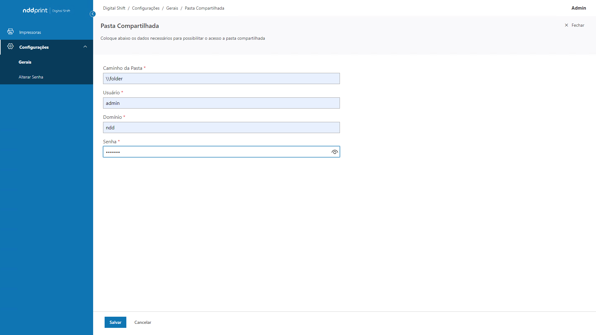 Caminho da Pasta: informe o caminho do diretório compartilhado na rede;