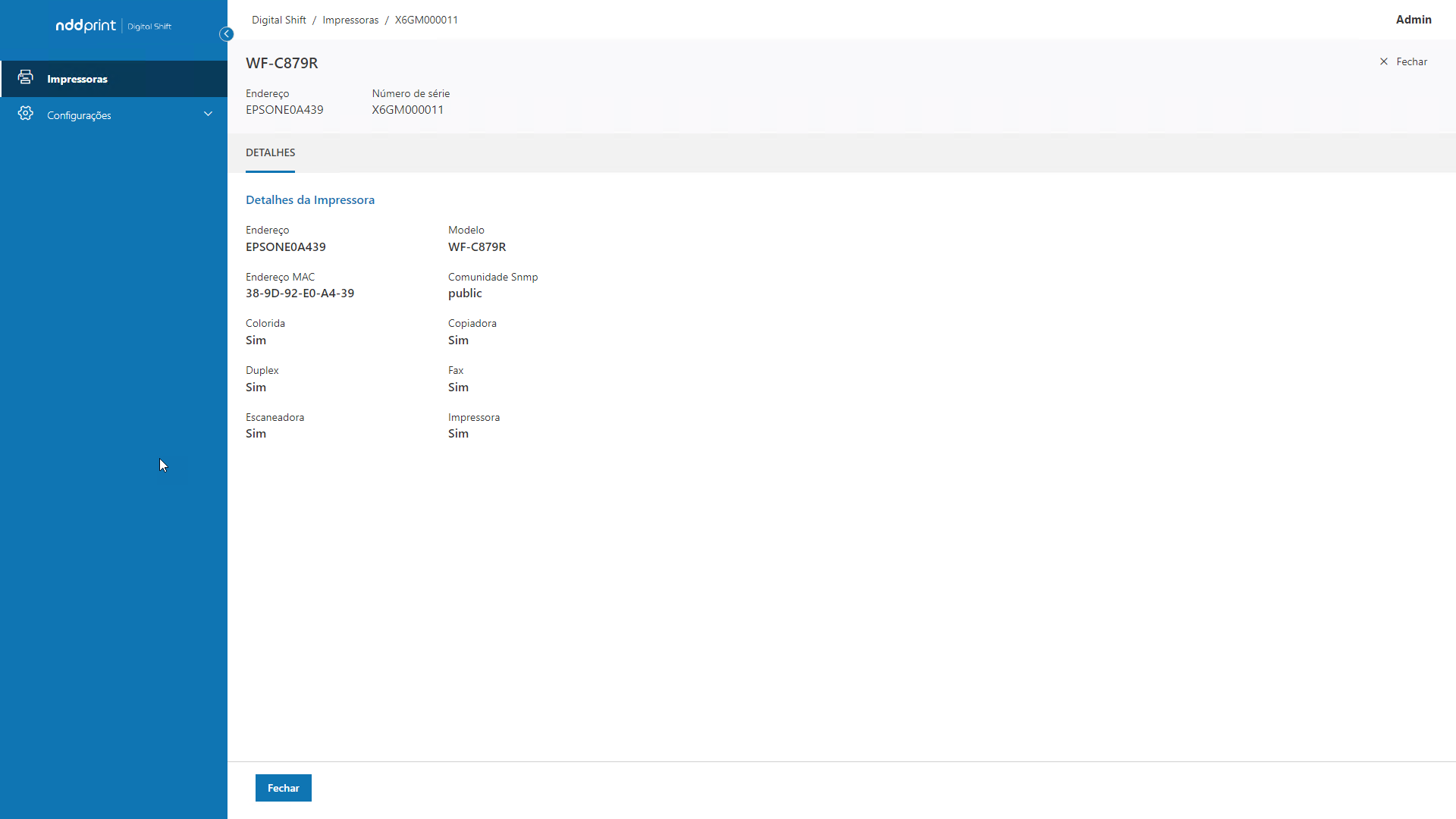 Aqui contém todas as informações do equipamento adicionado no NDD Print Digital Shift Epson.