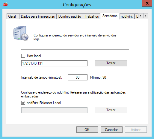 Na interface Servidores, configure o endereço do servidor onde está instalado o NDD Print Host e NDD Print Releaser. Para validar a comunicação, clique em Testar.