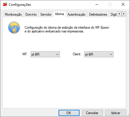 Idioma: Selecione o idioma que será apresentado na interface de administração do NDD Print MF Epson e na interface da solução embarcada no equipamento (NDD Print Client Epson).