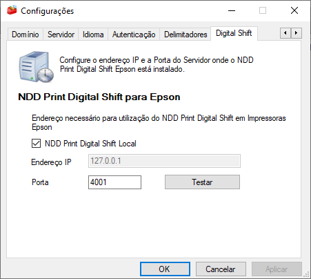 Endereço: Preencha o IP do servidor onde o NDD Print Digital Shift Epson está instalado.