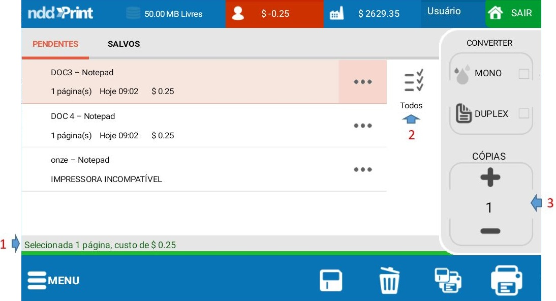 Quantidade de cópias: clique para aumentar/diminuir a quantidade de cópias de cada documento selecionado