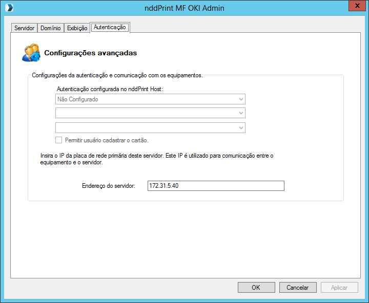 A autenticação escolhida no nddPrint Host irá ser listada nos campos abaixo. Caso esteja sendo mostrada a mensagem "Não configurado", verifique o nddPrint Host.