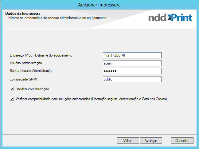 Insira os dados de Endereço IP ou nome da impressora, Usuário Administração, Senha Usuário Administração e Comunidade SNMP.
