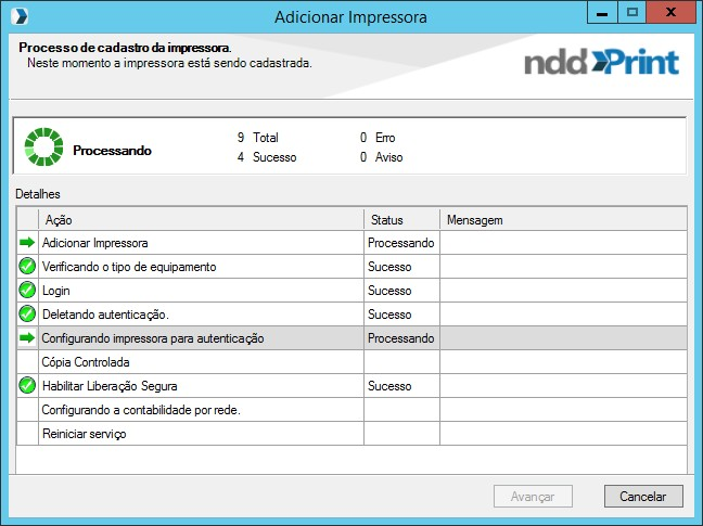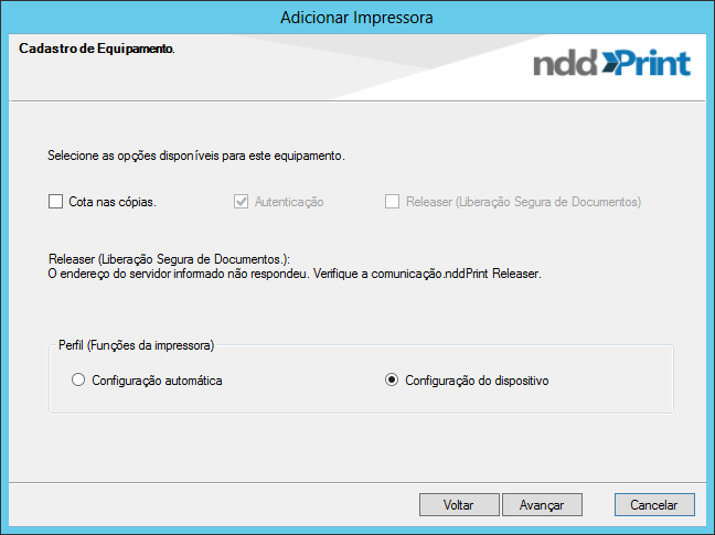 Caso o MF não consiga comunicação com o nddPrint Releaser, não será possível adicionar a liberação de documentos no equipamento. Verificar manual do nddPrint Client para maiores detalhes.