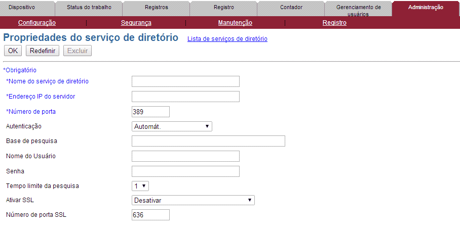 Para configurar a autenticação da impressora em um domínio, acessa-se o menu Administração > Manutenção > Serviços de Diretório, clica-se em Novo, onde preenche-se os dados referentes ao domínio a ser utilizado.